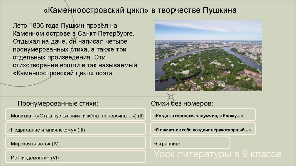 «Каменноостровский цикл» в творчестве ПушкинаЛето 1836 года Пушкин провёл на