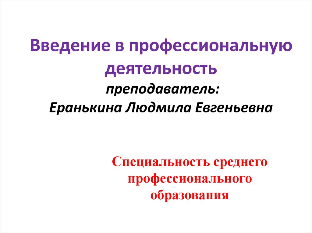 1. Введение в профессиональную деятельность преподаватель: Еранькина Людмила Евгеньевна