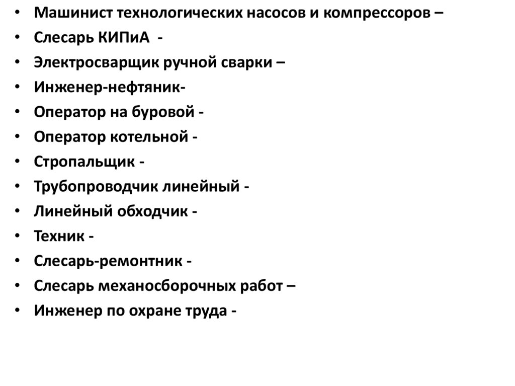 Инженер-нефтяникОператор на буровой Оператор котельной Стропальщик Трубопроводчик линейный Линейный обходчик Техник Слесарь-ремонтник Слесарь механосборочных работ –