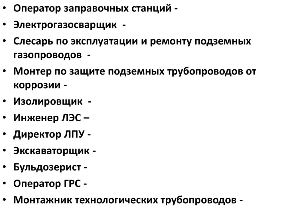 • Оператор заправочных станций • Электрогазосварщик • Слесарь по эксплуатации и ремонту подземныхгазопроводов • Монтер по защите подземных трубопроводов от