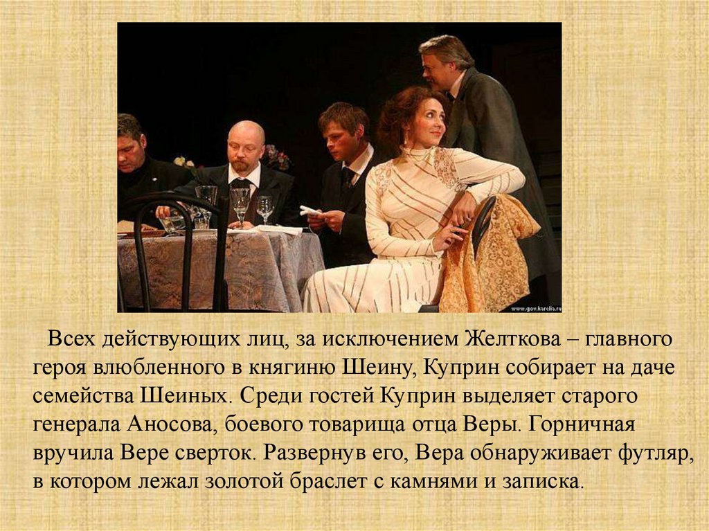 Всех действующих лиц, за исключением Желткова – главногогероя влюбленного в княгиню Шеину, Куприн собирает на даче