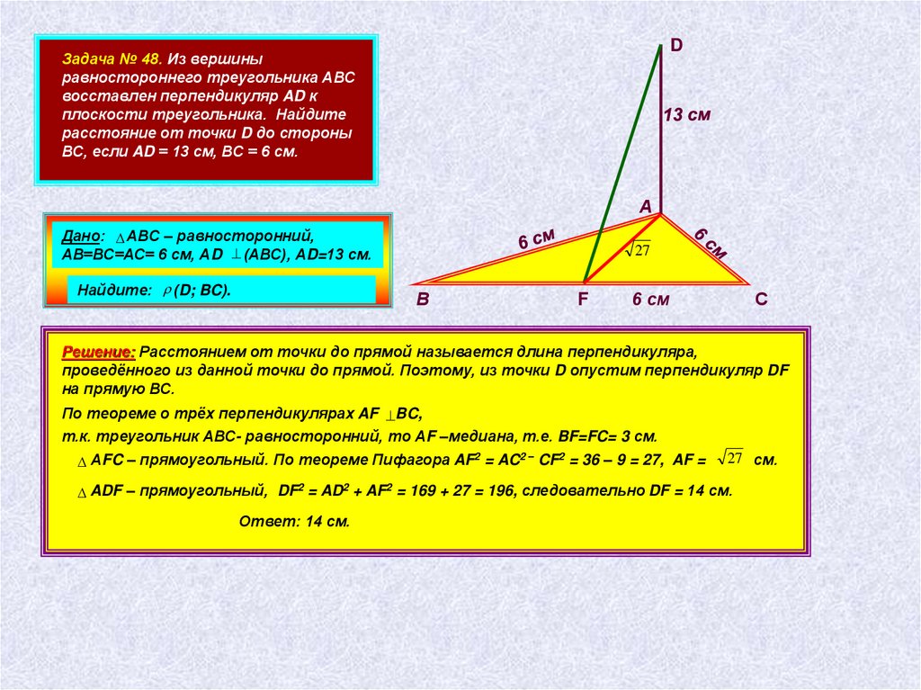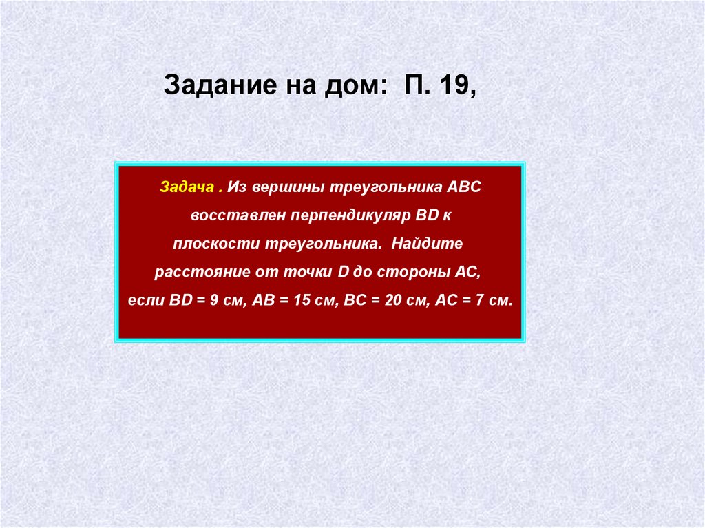 проведённого из данной точки до прямой. Поэтому, из точки D опустим