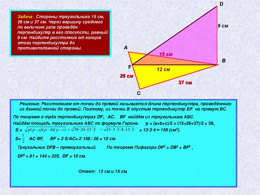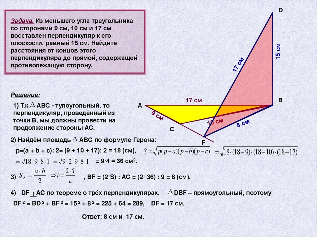 DF 2 = BD 2 + BF 2 = 15 2 + 8 2 = 225 + 64 = 289, DF = 17 см.