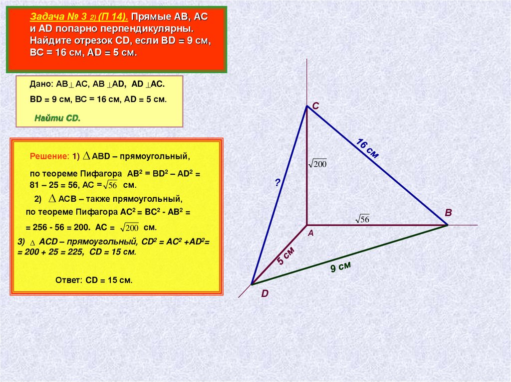 Задача № 3 2) (П 14). Прямые АВ, АСи AD попарно перпендикулярны.