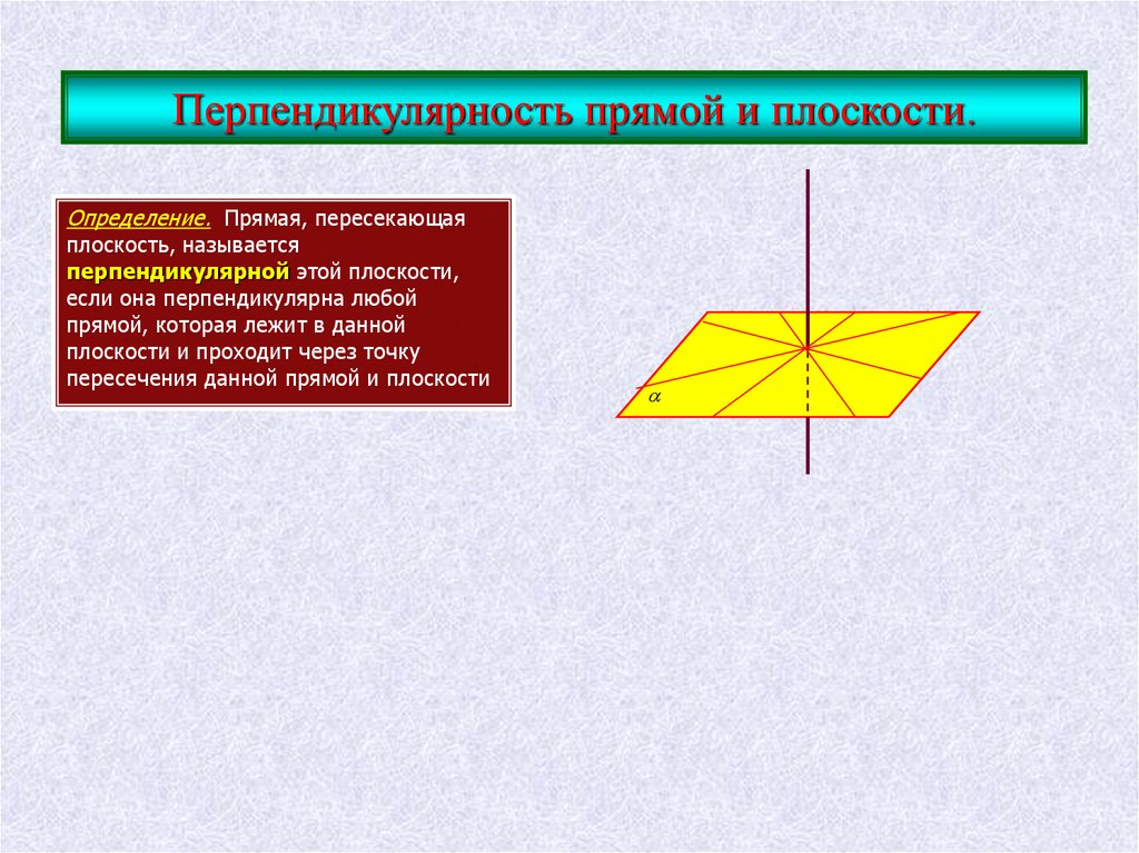 Перпендикулярность прямой и плоскости.Определение. Прямая, пересекающая
