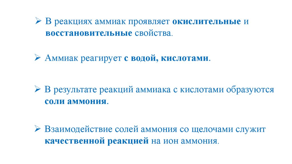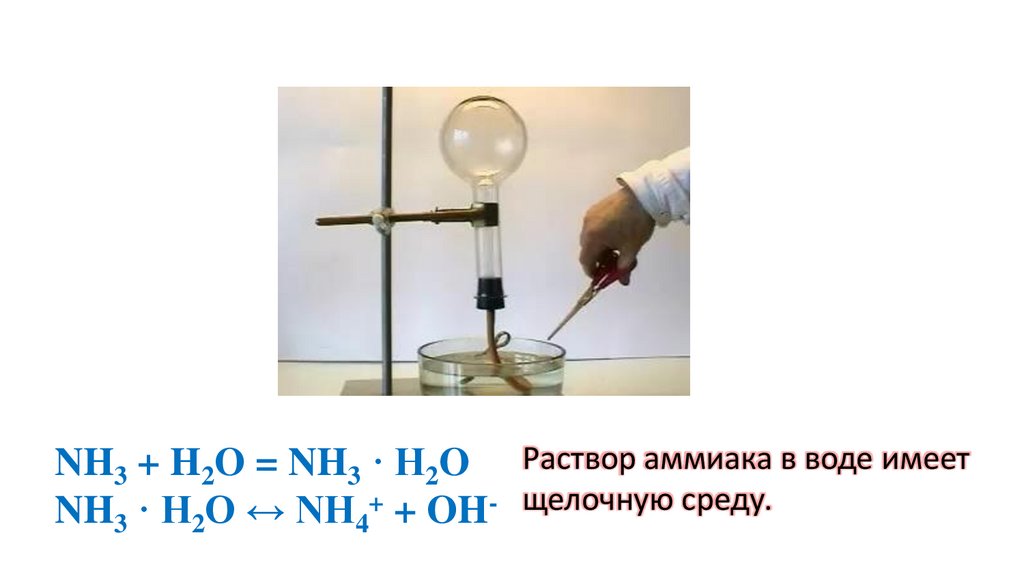 NH3 + H2O = NH3 · H2O Раствор аммиака в воде имеетNH3 · H2O ↔ NH4+ + OH- щелочную среду.