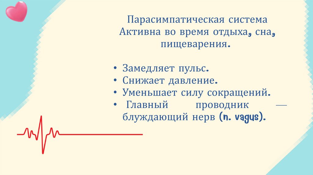 Парасимпатическая системаАктивна во время отдыха, сна,