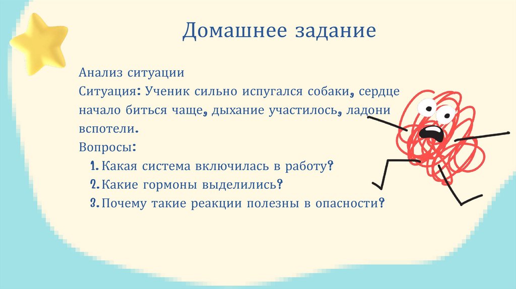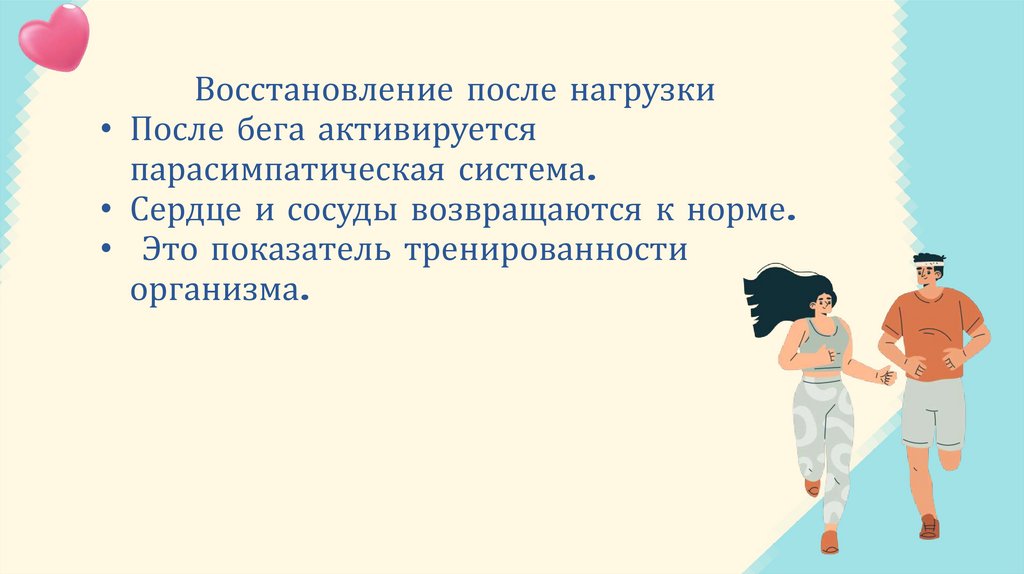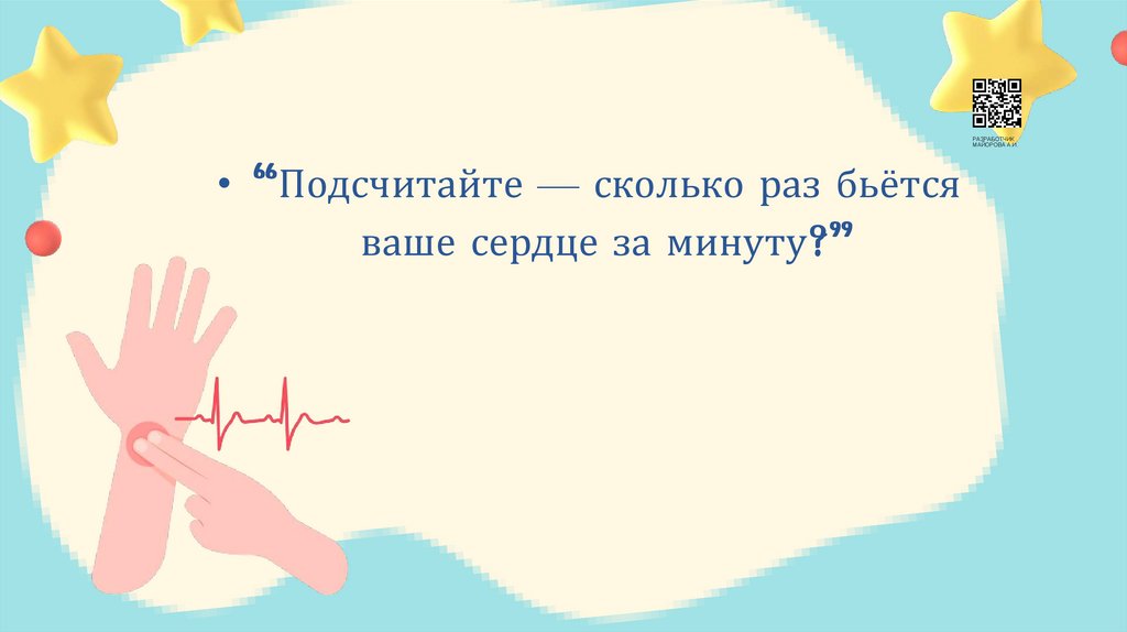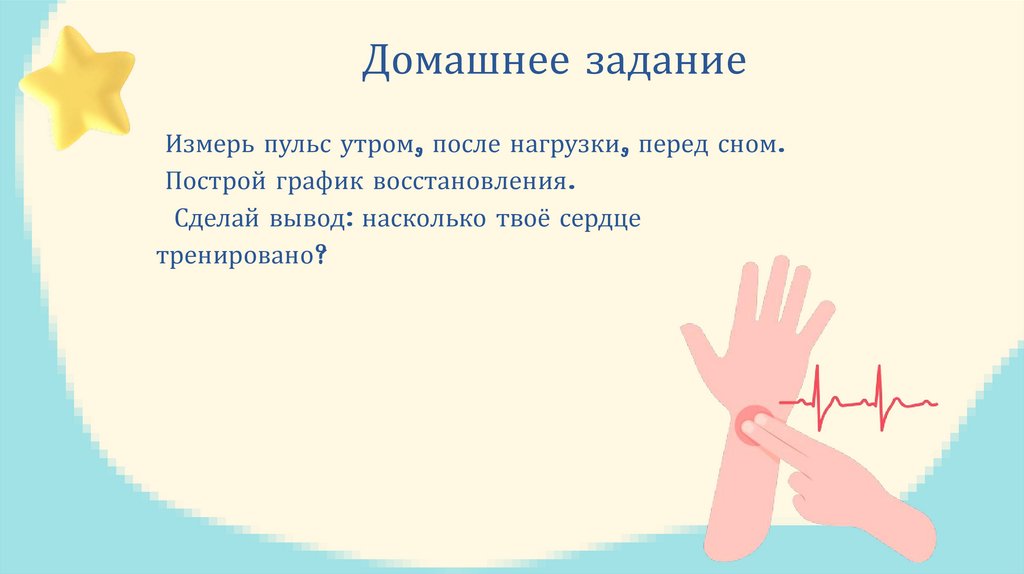 Домашнее заданиеИзмерь пульс утром, после нагрузки, перед сном.