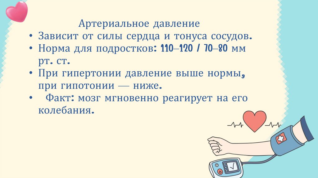 Артериальное давление• Зависит от силы сердца и тонуса сосудов.