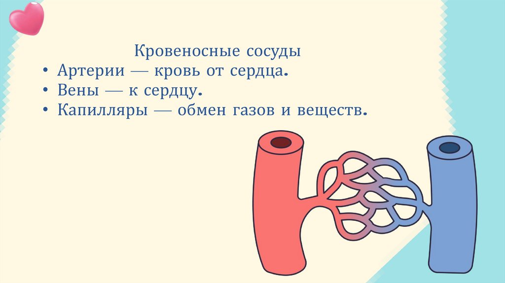 Кровеносные сосуды• Артерии — кровь от сердца.