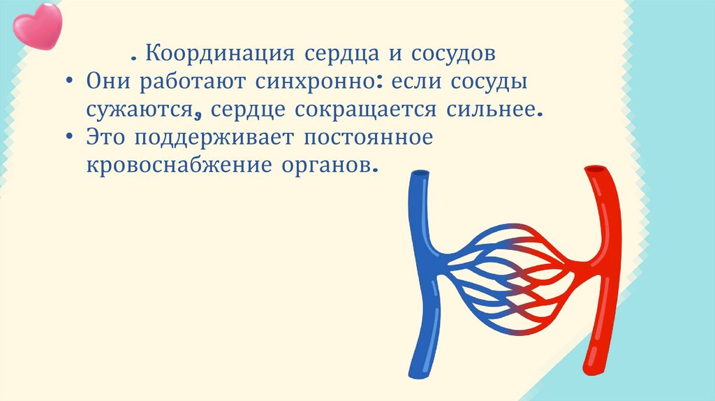 . Координация сердца и сосудов• Они работают синхронно: если сосуды