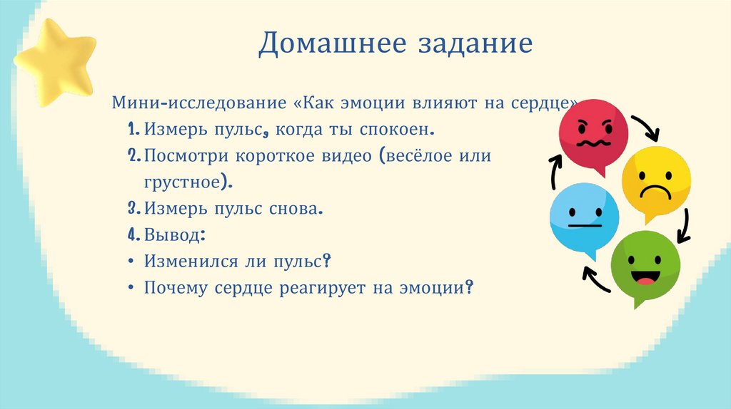 Домашнее заданиеМини-исследование «Как эмоции влияют на сердце»