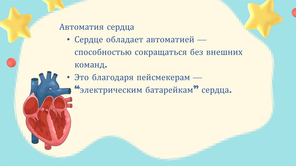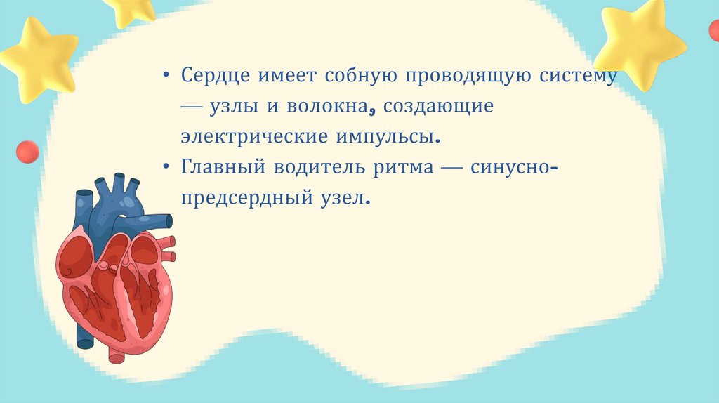 • Сердце имеет собную проводящую систему— узлы и волокна, создающие