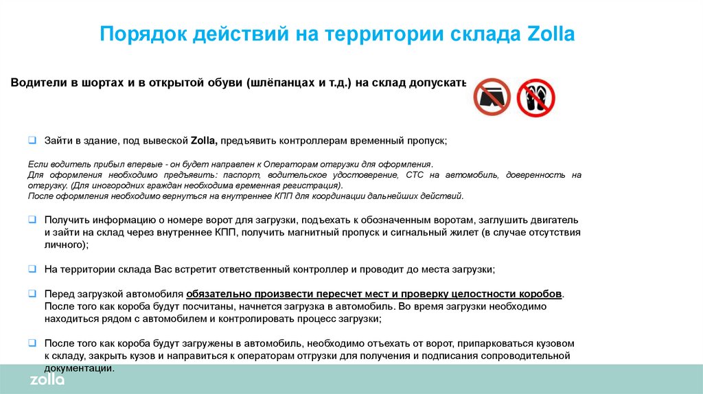 Порядок действий на территории склада ZollaВодители в шортах и в открытой обуви (шлёпанцах и т.д.) на склад допускаться не будут