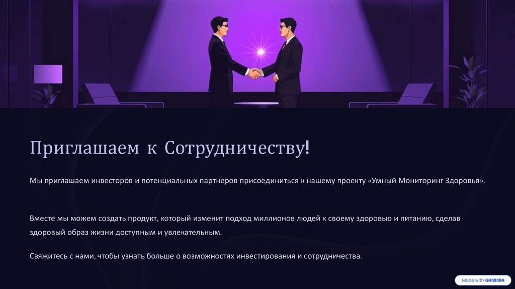 Приглашаем к Сотрудничеству!Мы приглашаем инвесторов и потенциальных партнеров присоединиться к нашему проекту «Умный Мониторинг Здоровья».