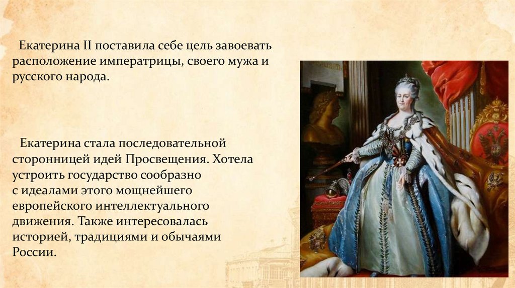 Екатерина II поставила себе цель завоеватьрасположение императрицы, своего мужа и