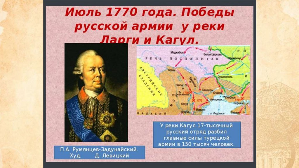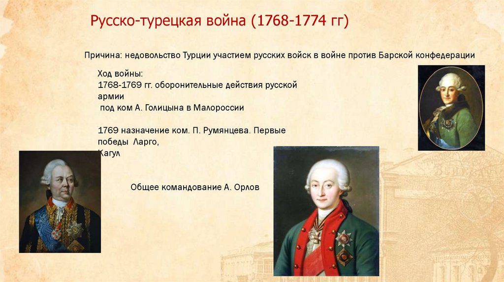 Русско-турецкая война (1768-1774 гг)Причина: недовольство Турции участием русских войск в войне против Барской конфедерации