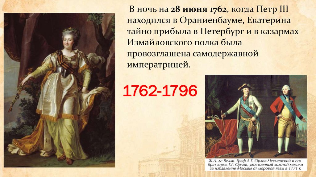 В ночь на 28 июня 1762, когда Петр IIIнаходился в Ораниенбауме, Екатерина