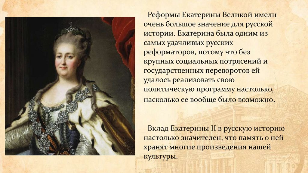 Реформы Екатерины Великой имелиочень большое значение для русской