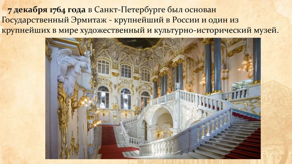 7 декабря 1764 года в Санкт-Петербурге был основанГосударственный Эрмитаж - крупнейший в России и один из