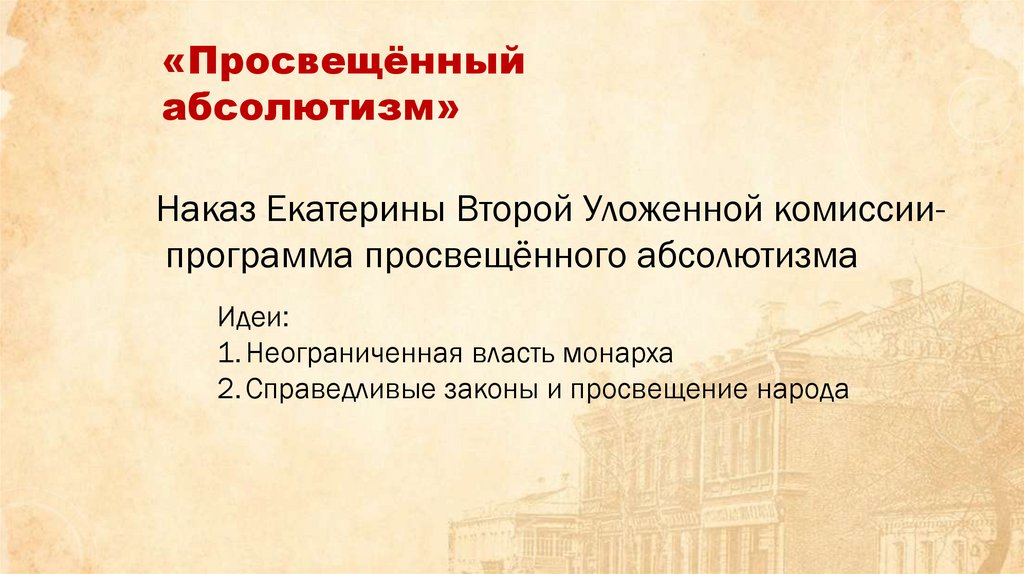 Наказ Екатерины Второй Уложенной комиссиипрограмма просвещённого абсолютизма.