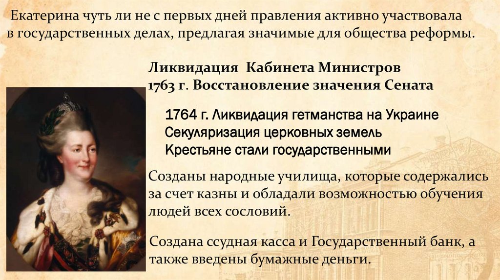 Екатерина чуть ли не с первых дней правления активно участвовалав государственных делах, предлагая значимые для общества реформы.