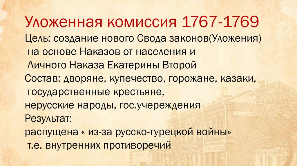 Уложенная комиссия 1767-1769Цель: создание нового Свода законов(Уложения)
