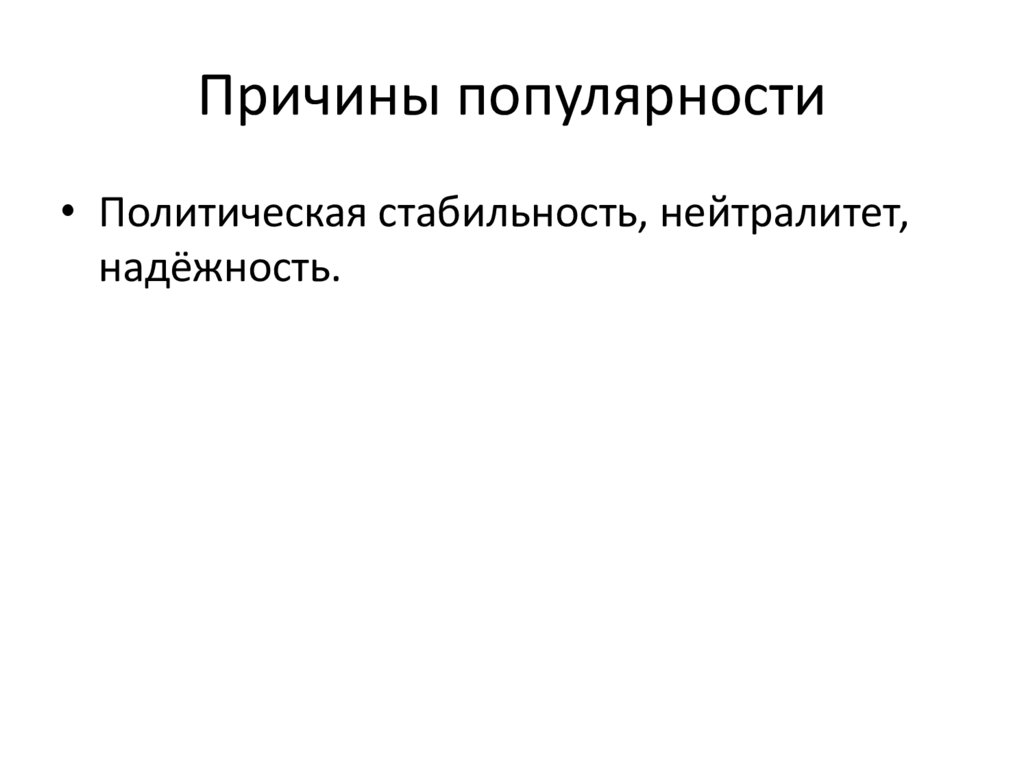 Причины популярности• Политическая стабильность, нейтралитет,