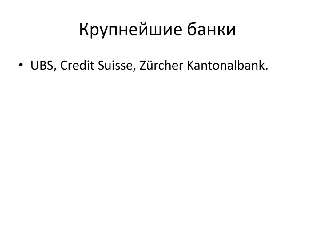 Крупнейшие банки• UBS, Credit Suisse, Zürcher Kantonalbank.