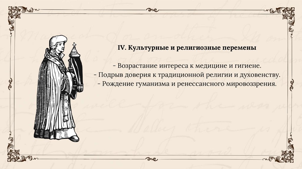 IV. Культурные и религиозные перемены- Возрастание интереса к медицине и гигиене.