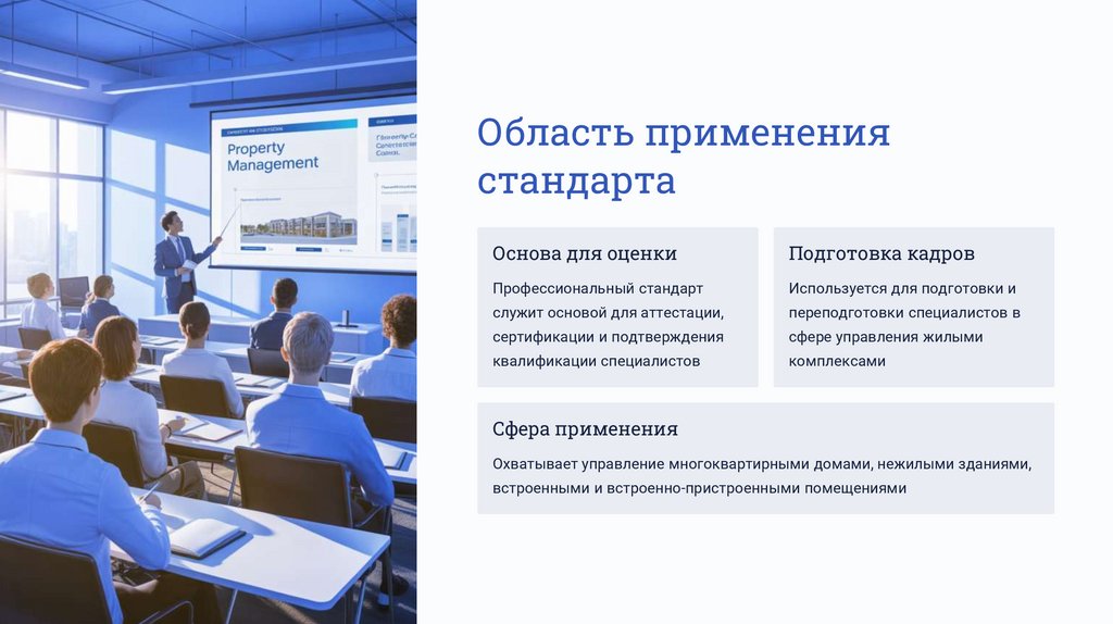 Охватывает управление многоквартирными домами, нежилыми зданиями,