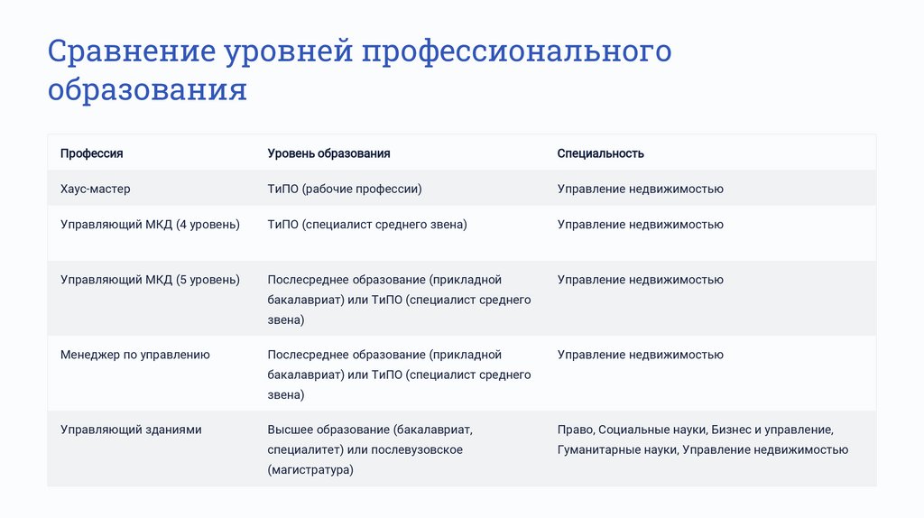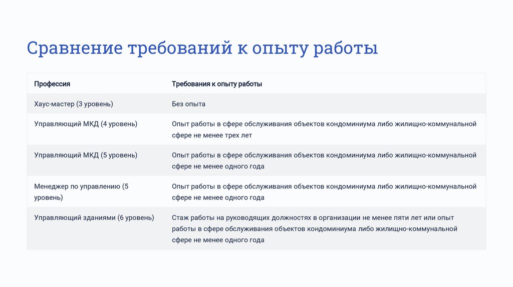 Управление недвижимостью. Стаж работы на руководящих должностях не менее пяти лет или опыт в сфере обслуживания объектов кондоминиума не менее одного года.