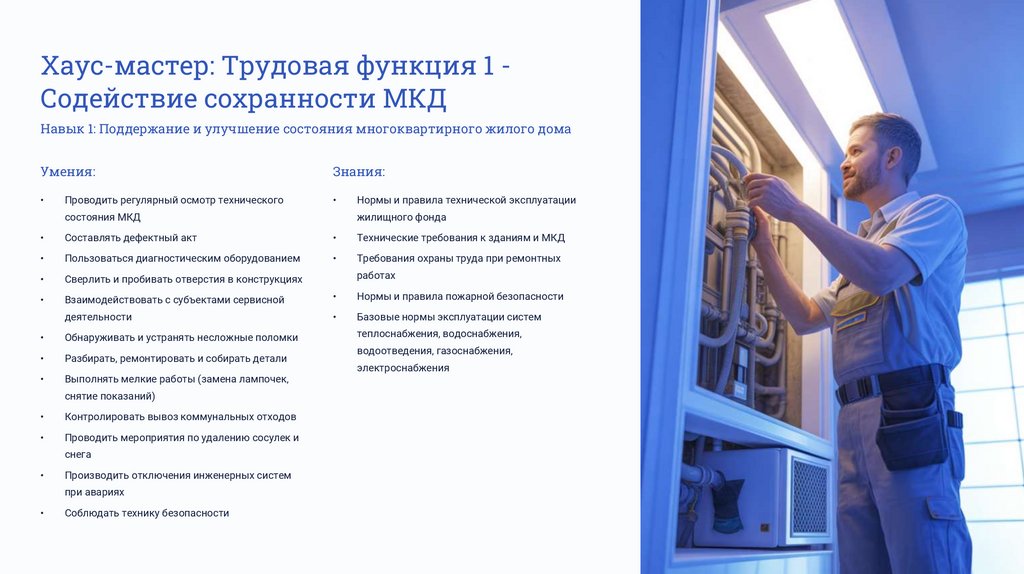 Знания: НПА по жилищным отношениям и ЖКХ, нормы и правила технической
