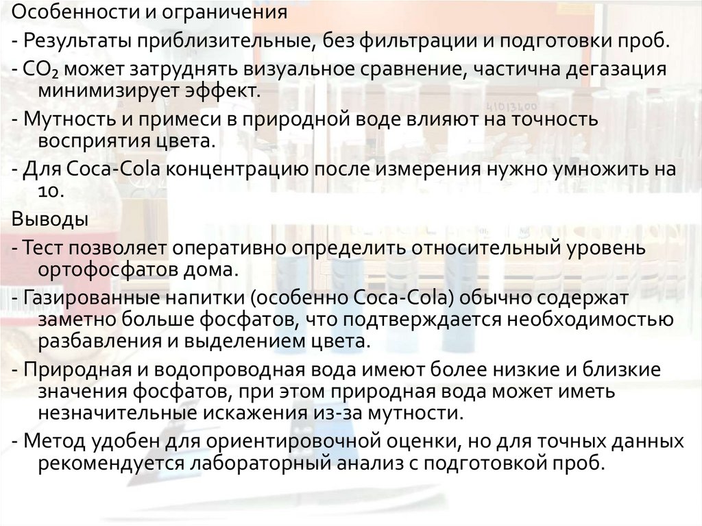 8. Определить наличие и сравнить содержание фосфатов в различных напитках и образцах воды, доступных в бытовых условиях