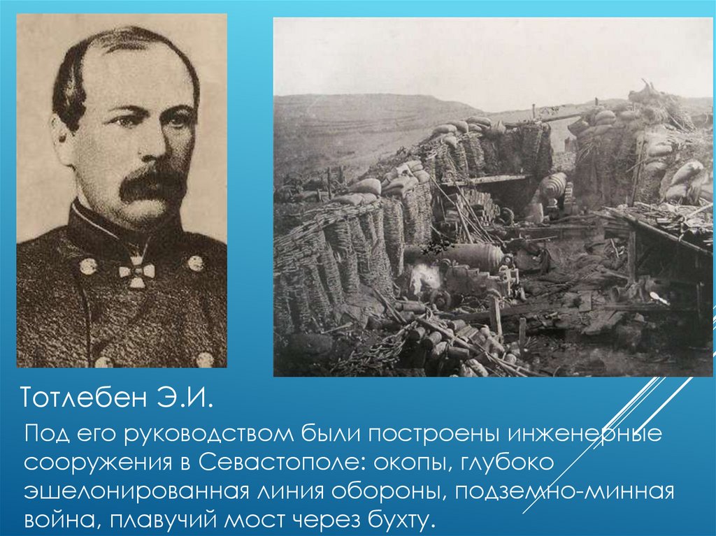 Тотлебен Э.И.Под его руководством были построены инженерные