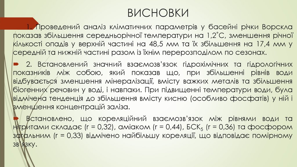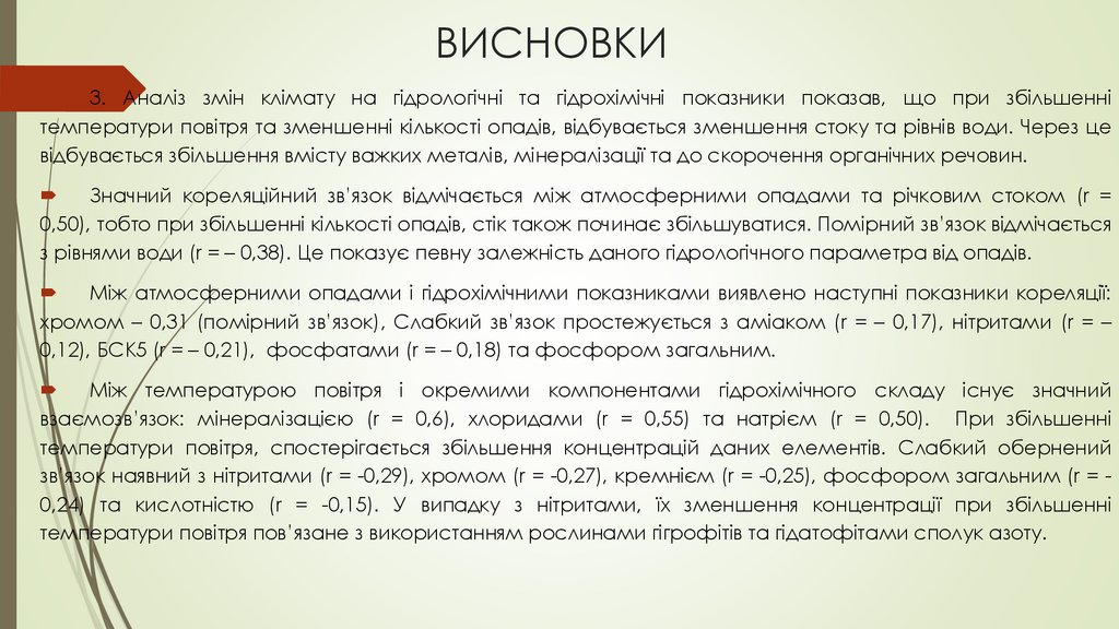 ВИСНОВКИ3. Аналіз змін клімату на гідрологічні та гідрохімічні показники показав, що при збільшенні