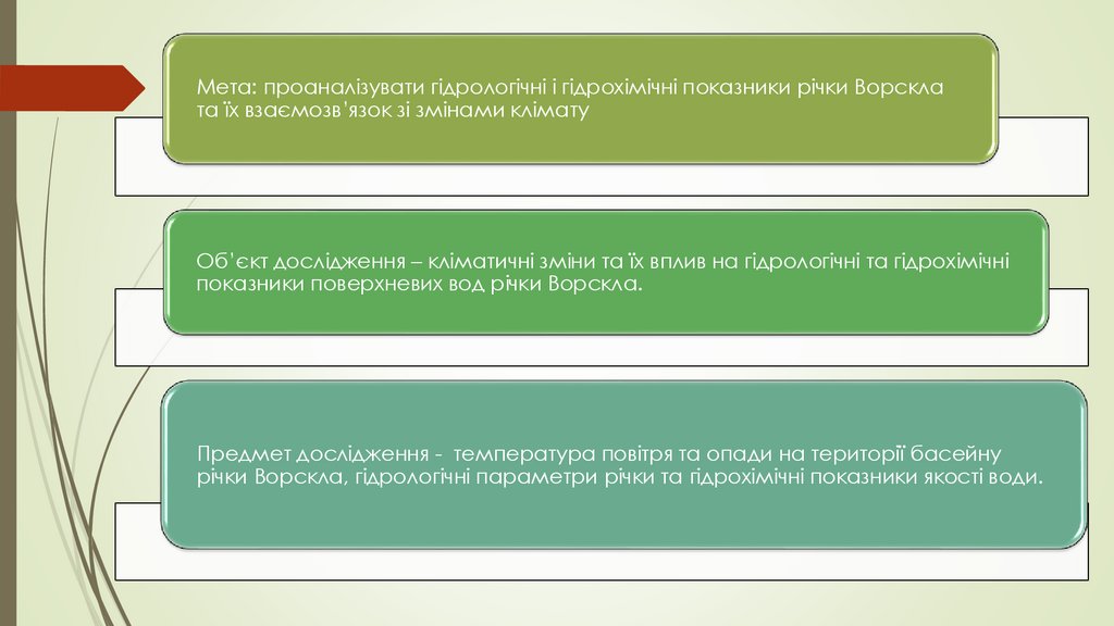 Мета: проаналізувати гідрологічні і гідрохімічні показники річки Ворсклата їх взаємозв’язок зі змінами клімату