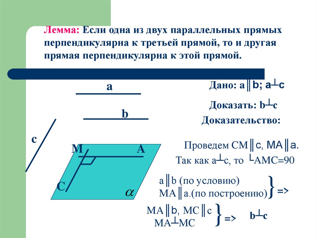 Лемма: Если одна из двух параллельных прямыхперпендикулярна к третьей прямой, то и другая
