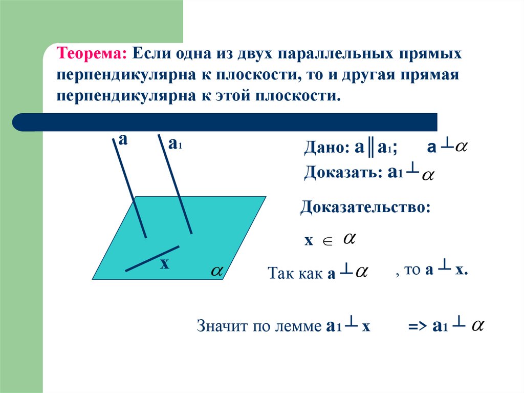 Теорема: Если одна из двух параллельных прямыхперпендикулярна к плоскости, то и другая прямая