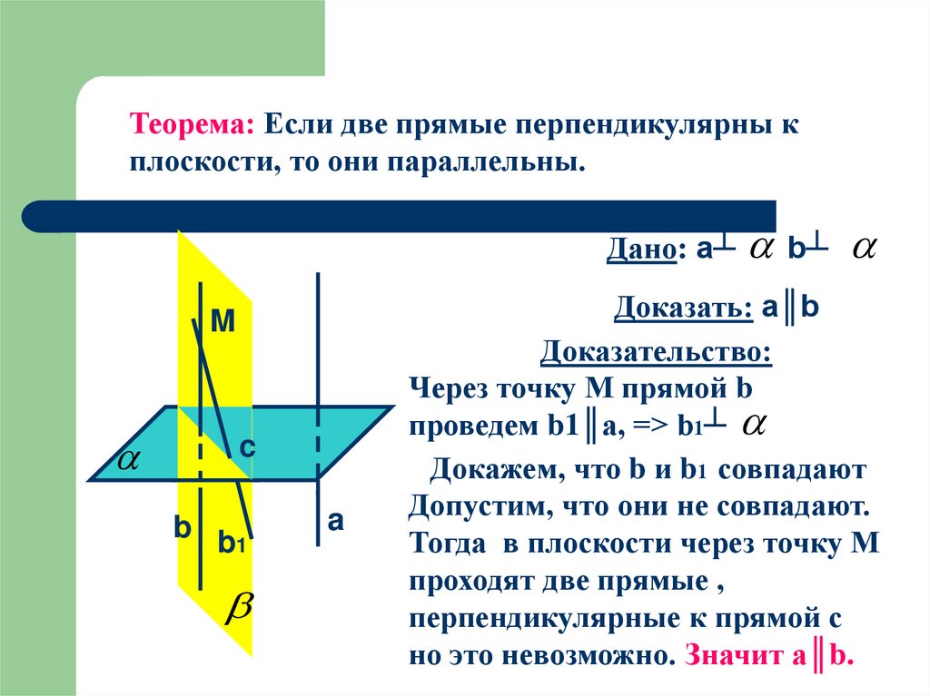 Теорема: Если две прямые перпендикулярны кплоскости, то они параллельны.