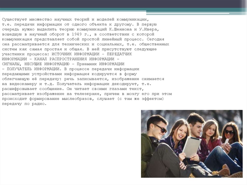 Существует множество научных теорий и моделей коммуникации,т.е. передачи информации от одного объекта к другому. В первую