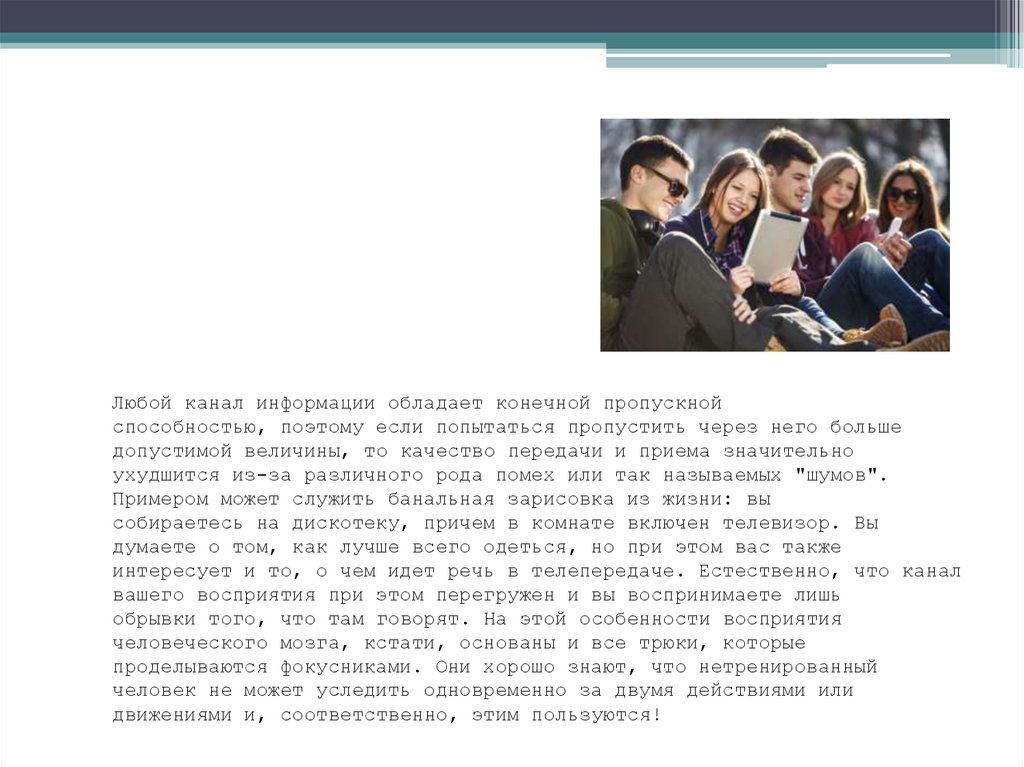 Любой канал информации обладает конечной пропускнойспособностью, поэтому если попытаться пропустить через него больше
