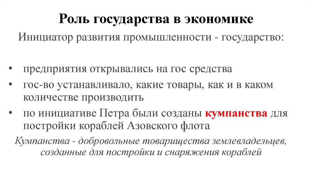 Роль государства в экономикеИнициатор развития промышленности - государство: