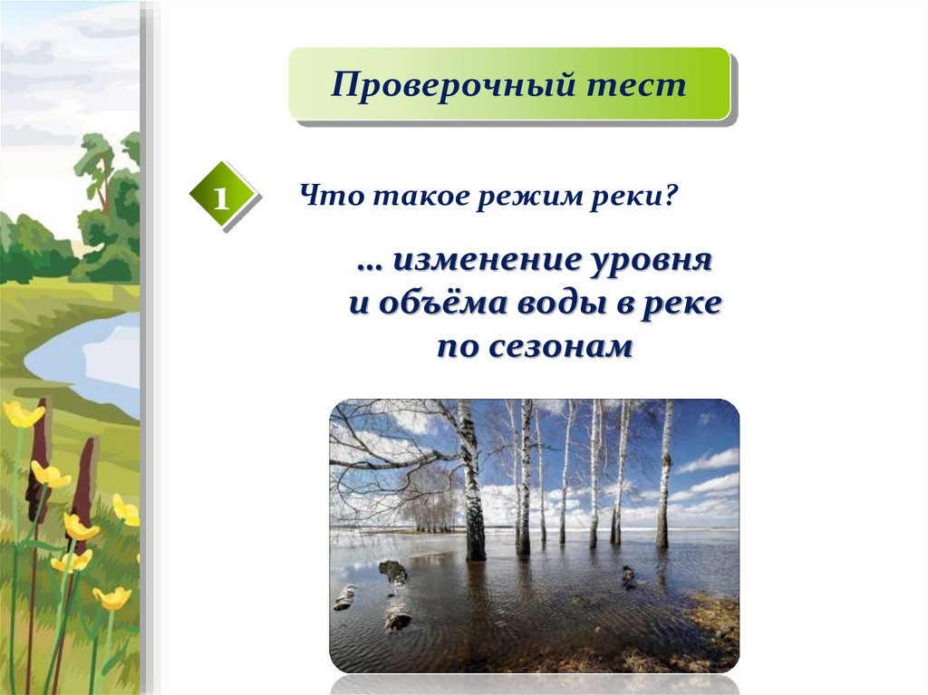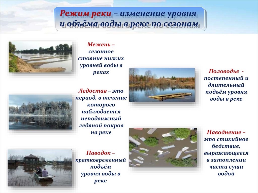 Режим реки – изменение уровняи объёма воды в реке по сезонам