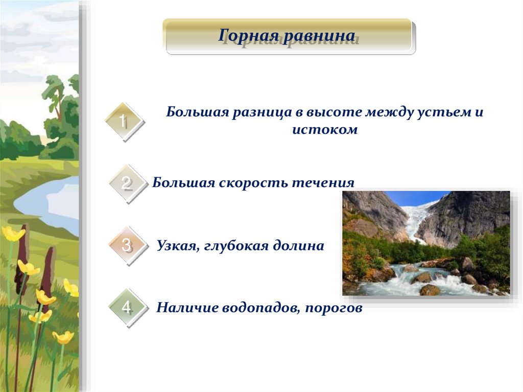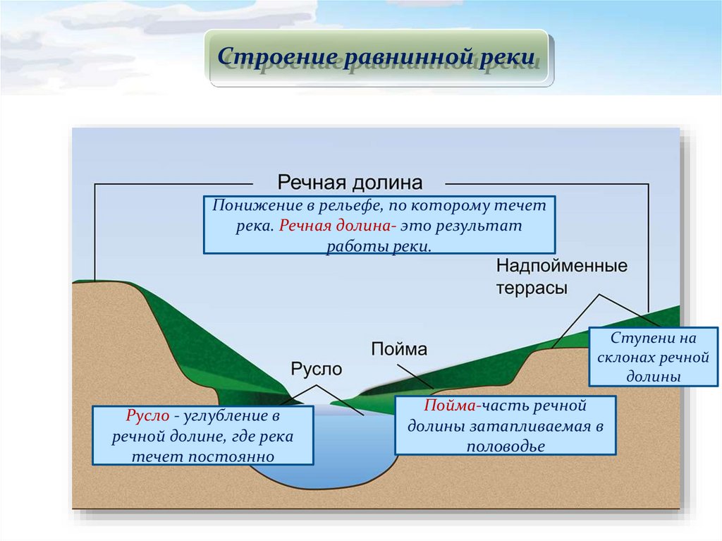 Строение равнинной рекиПонижение в рельефе, по которому течет