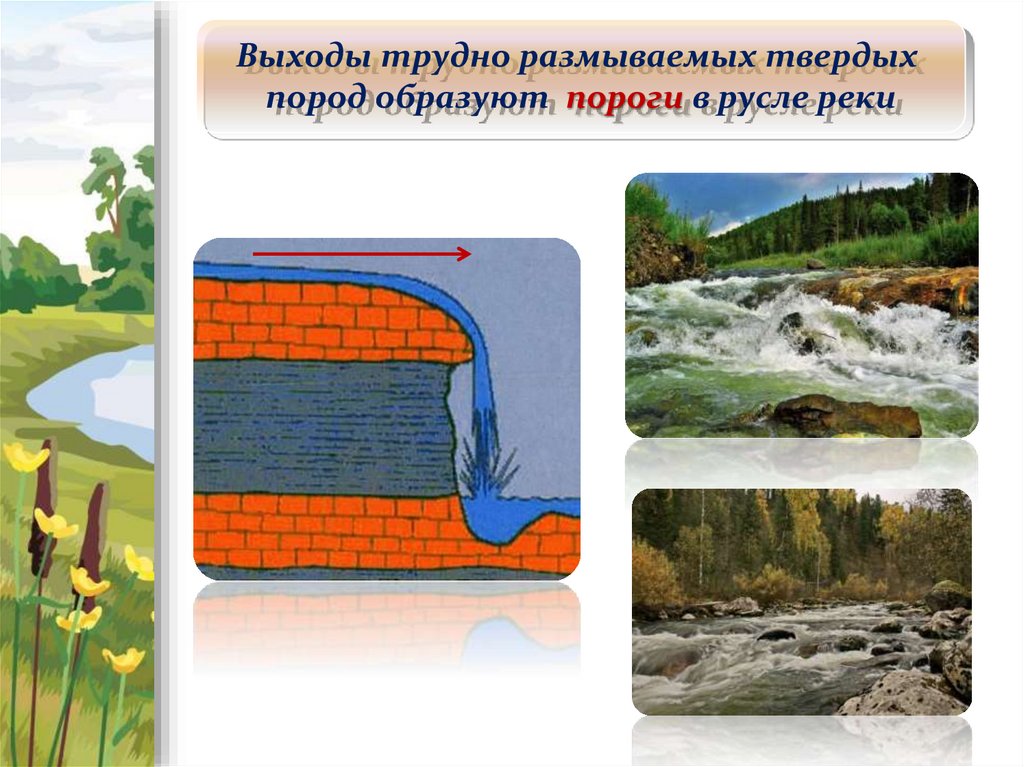 Выходы трудно размываемых твердыхпород образуют пороги в русле реки