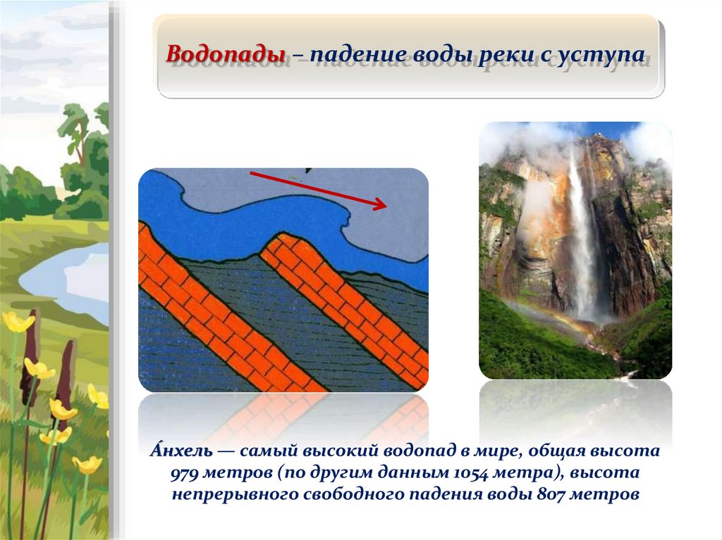 Водопады – падение воды реки с уступаА́нхель — самый высокий водопад в мире, общая высота