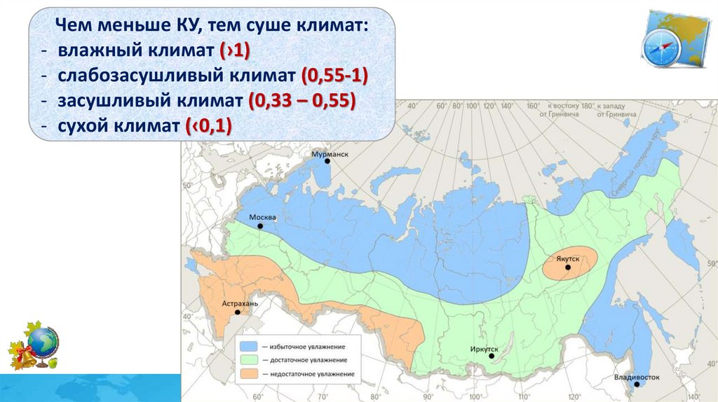 Чем меньше КУ, тем суше климат:- влажный климат (›1)