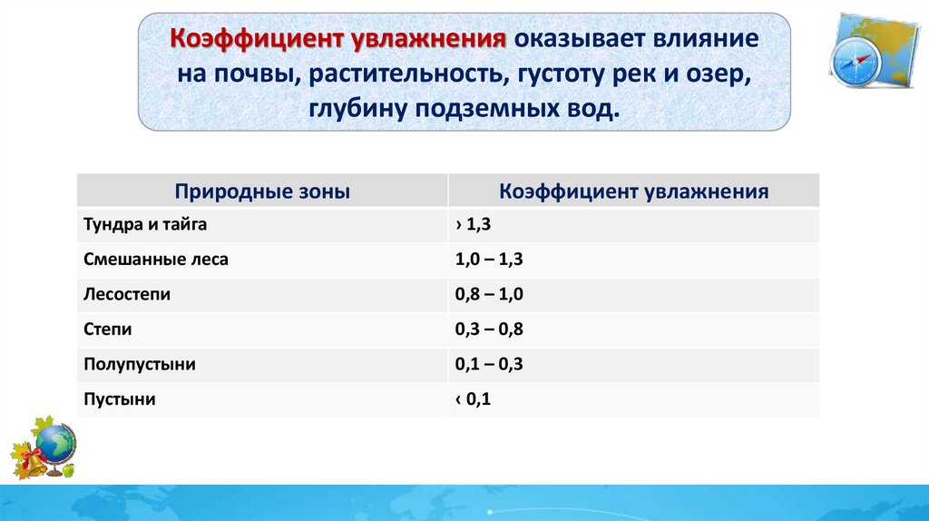 Коэффициент увлажнения оказывает влияниена почвы, растительность, густоту рек и озер,