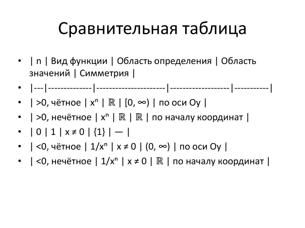 Сравнительная таблица• | n | Вид функции | Область определения | Область